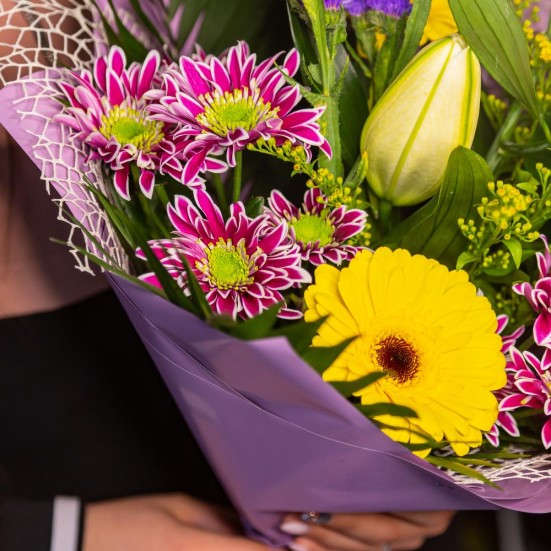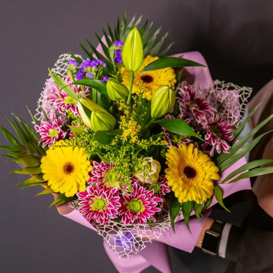 Букет с розами, хризантемами, лилиями, герберами в Дзержинске